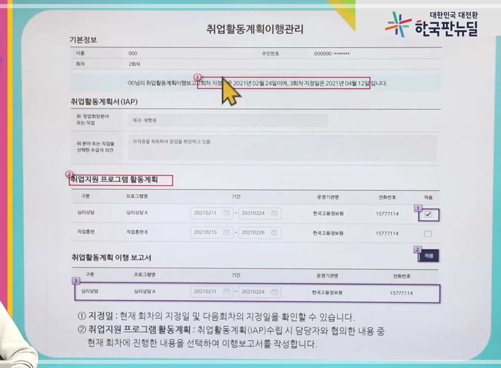 이 중 현재 회차에 진행한 내용을 선택한 후에 이 적용 버튼을 눌러서 이행 보고서를 작성하시면 됩니다. 그다음 구직 활동 이행 보고서는 입사 지원 동행 면접 등 구직 활 이행 내용에 대한 사항을 입력해 주시면 됩니다. 취업 활동 계획 이행을 거짓으로 신고할 때는 부정 수급이 될 수 있으니 사실 그대로 작성해 주세요.