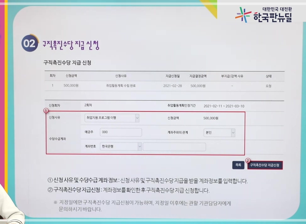 활동 이행 보고서 제출 후에는 구직 촉진 수당 지급 신청 항목이 표시됩니다. 구직 촉진수당을 신청하시는 분들은 신청 사유와 받으신 계좌에 관한 정보를 입력해서 구직. 촉진수당 지급 신청 버튼 클릭해 주세요. 지정일에 구직 촉진 수당 신청서를 제출하지 않으면 해당 회차의 구직 촉진 수당은 소멸합니다.