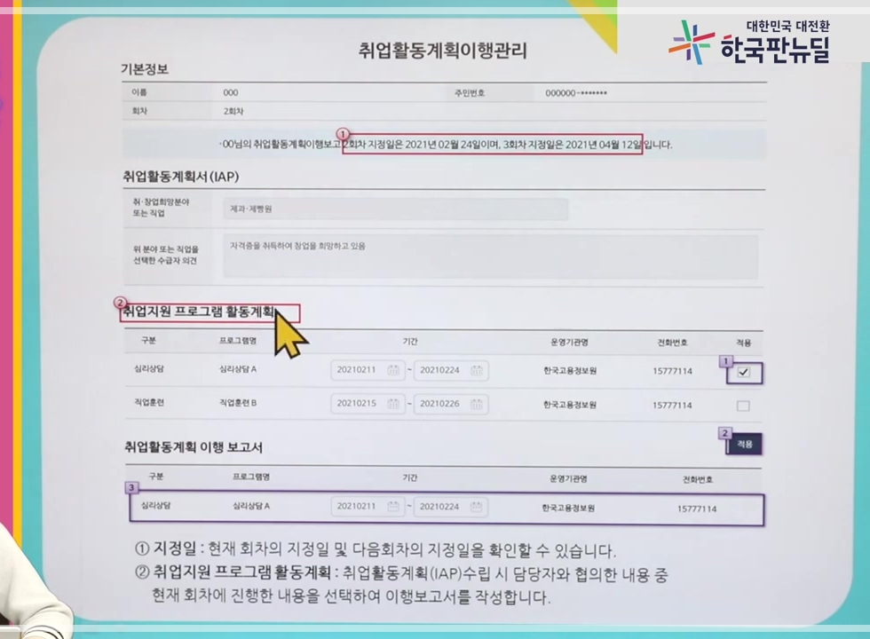 또 이와 별도로 지정일 5일 전과 하루 전에 지정일을 미리 카카오 알림 통신 대화나 문자로 알려드릴 텐데요. 지정된 날짜에만 구직촉진 수당 신청이 가능하니 잘 확인해 주세요. 다음 취업 지원 프로그램 활동 계획은 참여자분이 상담사와 협의하며 수립했던 취업 지원 프로그램을 보여줍니다.