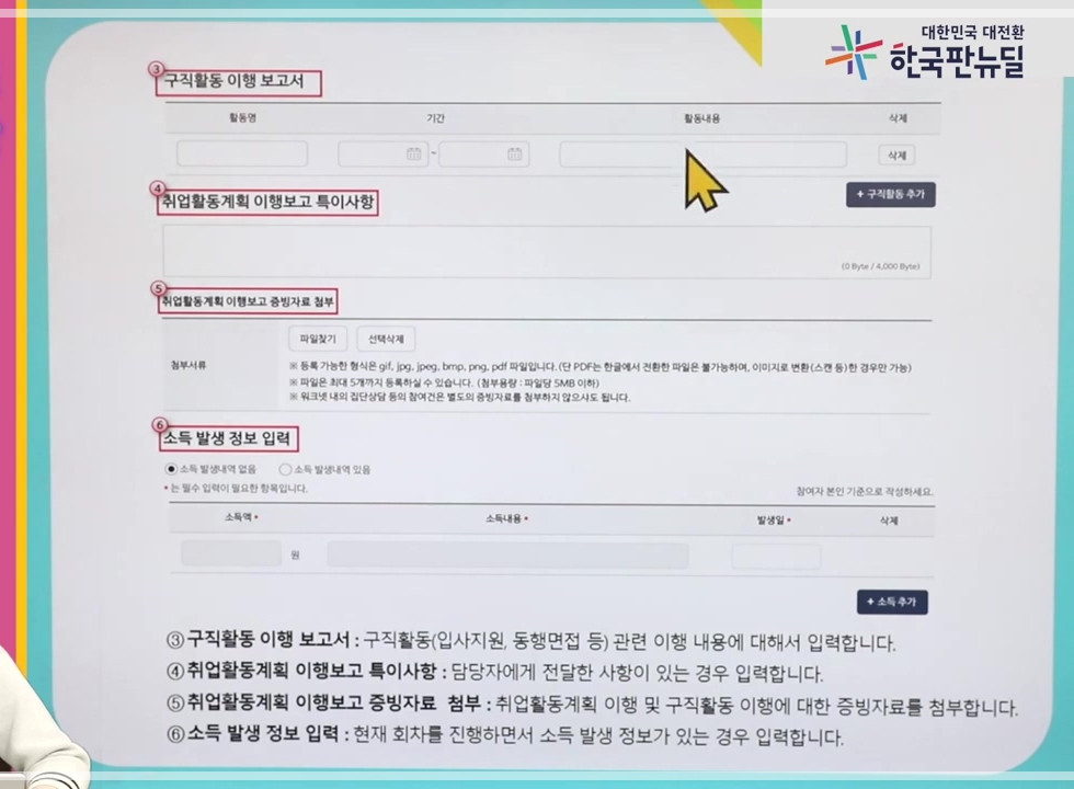 취업 활동 계획을 이행하시던 도중 특이 사항을 발견했거나 증빙 자료에 대한 부가 설명 등이 필요하면 취업 활동 계획 이행 보고 특이사항 난을 이용해 주시면 됩니다. 참여자분이 이행한 취업 활동 계획에 대한 증빙 자료가 필요한 경우 예를 들어 면접 확인서 온라인 입사 지원 명세서 등은 취업 활동 계획 이행 보고 증빙 자려 함을 이용해서 올려 주시면 됩니다.