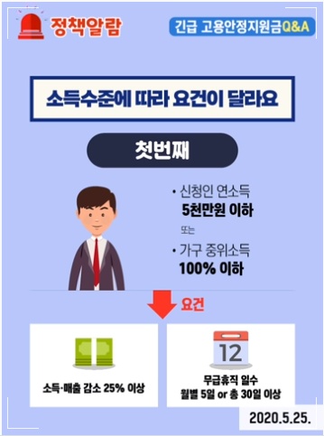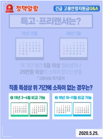 특수고용 프리랜서의 경우 2019년 12월부터 2020년 1월 사이 50만원 이상의 소득이 생겼거나, 10일 이상의 노무를 제공하였는데 고용보험 미가입자일 경우 긴급 고용 안정 지원금의 대상입니다. 반드시 살펴봐야 하는 것은 소득기준과 소득 감소 요건 또는 무급 휴직일 수입니다.