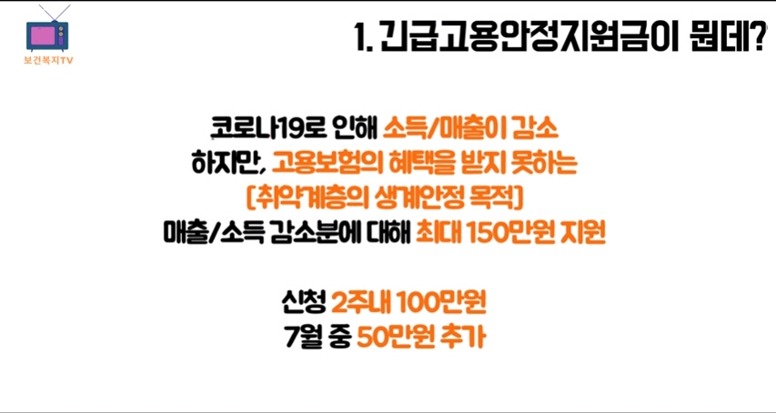 코로나19 긴급고용안정지원금은 고용보험의 사각지대에 놓은 국민들의 생계 안정을 위해 코로나 이후 지난 3개월간 매출과 소득 감소분을 지원하는데 월 50만 원씩 총 150만 원 지원한다고 발표하였습니다.