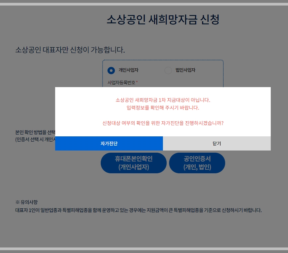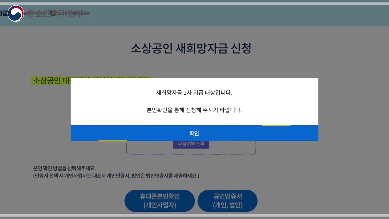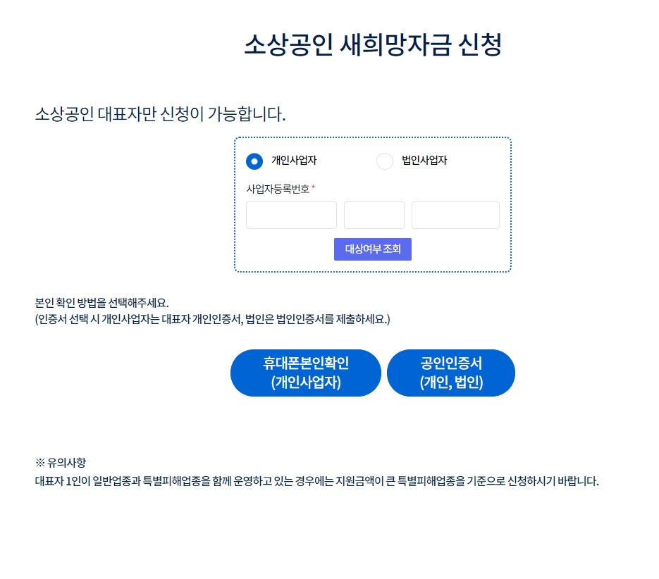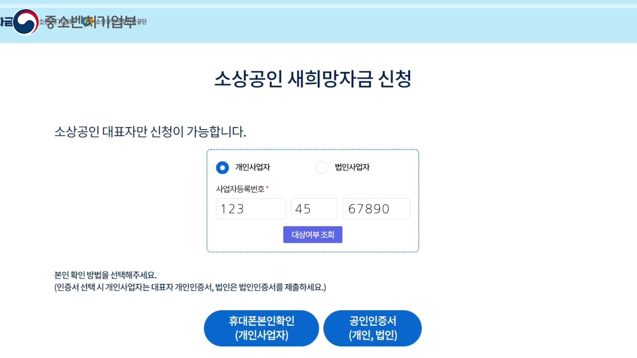 대상자가 맞다면 신청하기 버튼을 누릅니다. 휴대폰이나 공인인증서를 통해 본인 확인을 진행합니다. 법인사업체인 경우 사업자번호와 법인등록번호를 모두 입력해야 합니다.