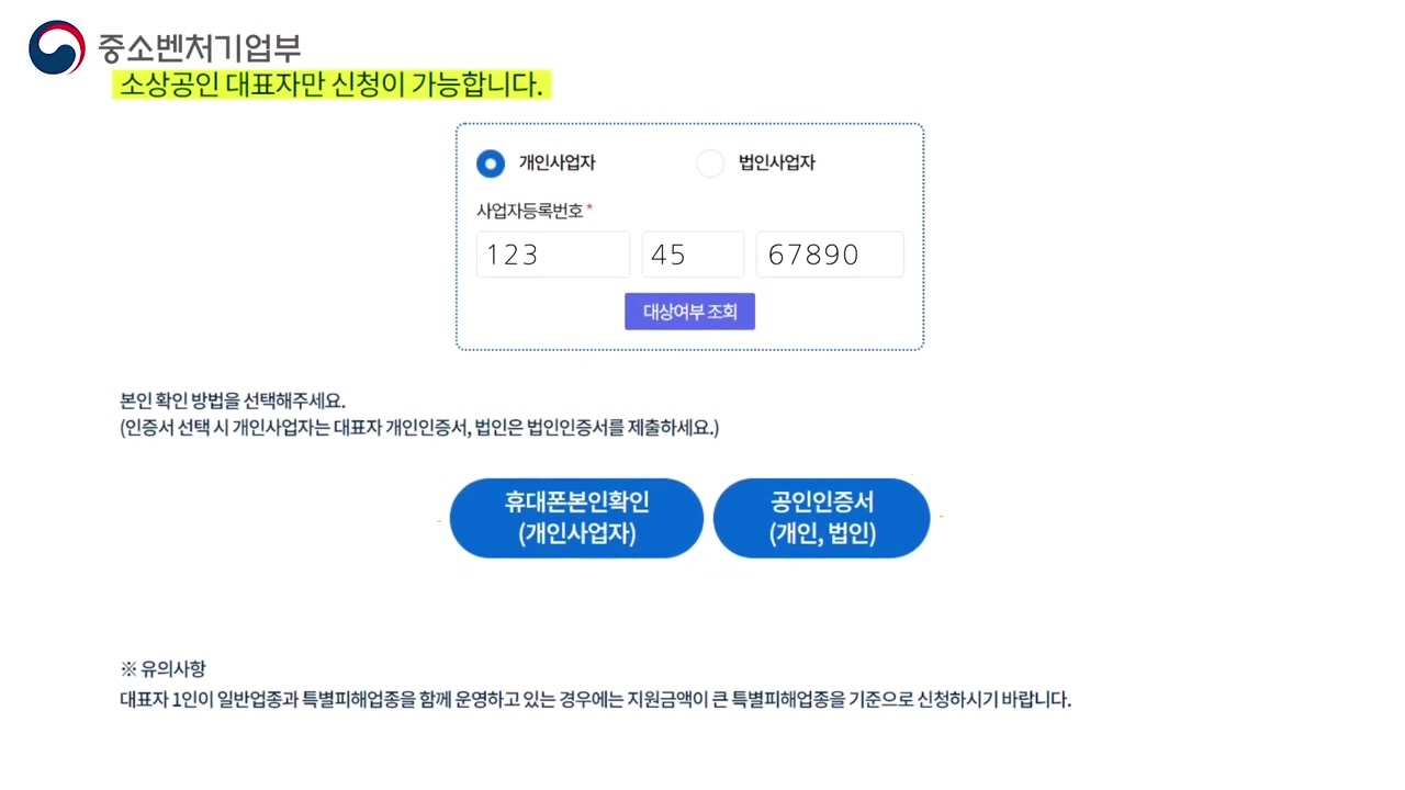대표자만이 신청 가능하며 사업체가 여러 개인 경우 한 개 사업체만 신청 가능합니다. 신청 기준 등을 사전에 꼭 확인하시고 적합한 사업체의 사업자등록번호를 입력하세요.