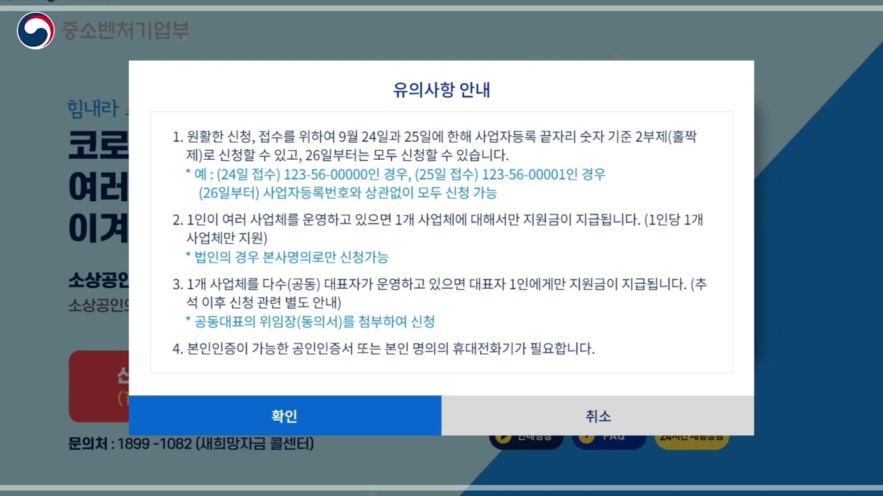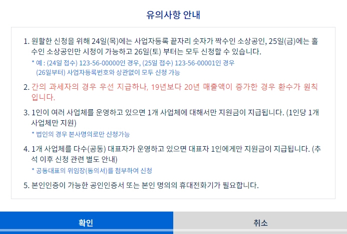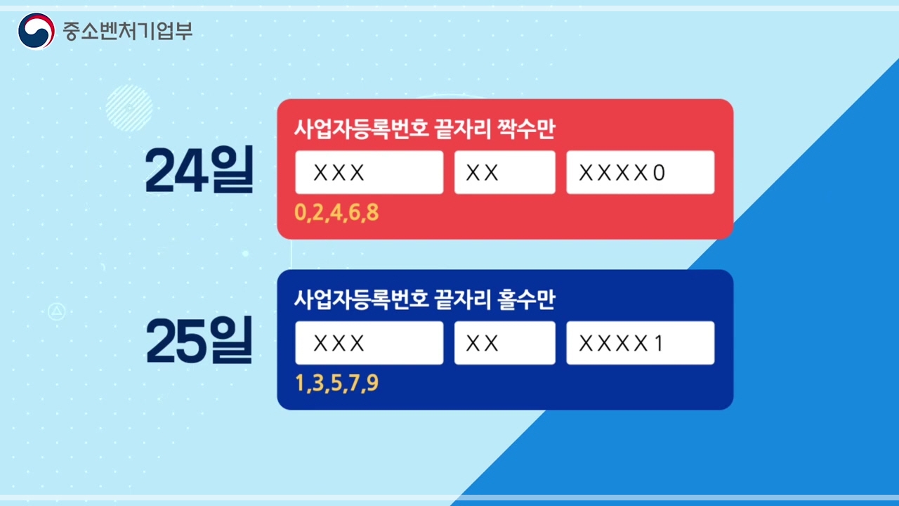 9월 24일과 25일에 한하여 원활한 신청 접수를 위해 사업자등록번호 끝자리 기준 짝, 홀수 2부제를 실시합니다. 24일은 짝, 25일은 홀수인 사업자가 신청할 수 있습니다.