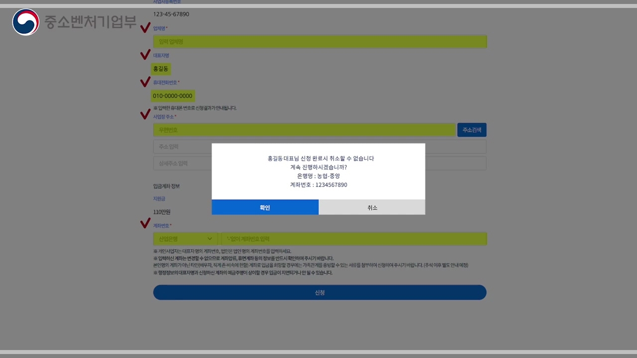 새부 정보를 다 입력하신 후 신청을 선택합니다. 개인 사업자는 대표자 명의 계좌번호를 압력해야 합니다. 한번 더 신청화면이 나타나면 신청 여부를 확인합니다.