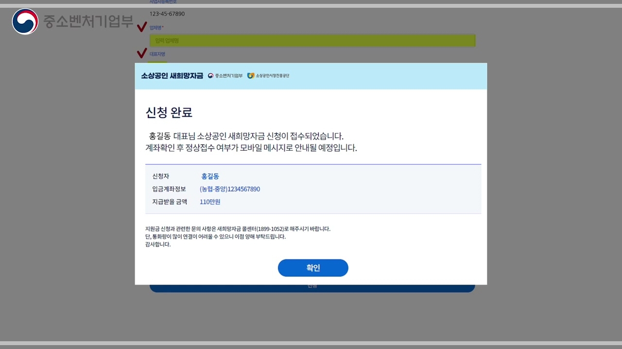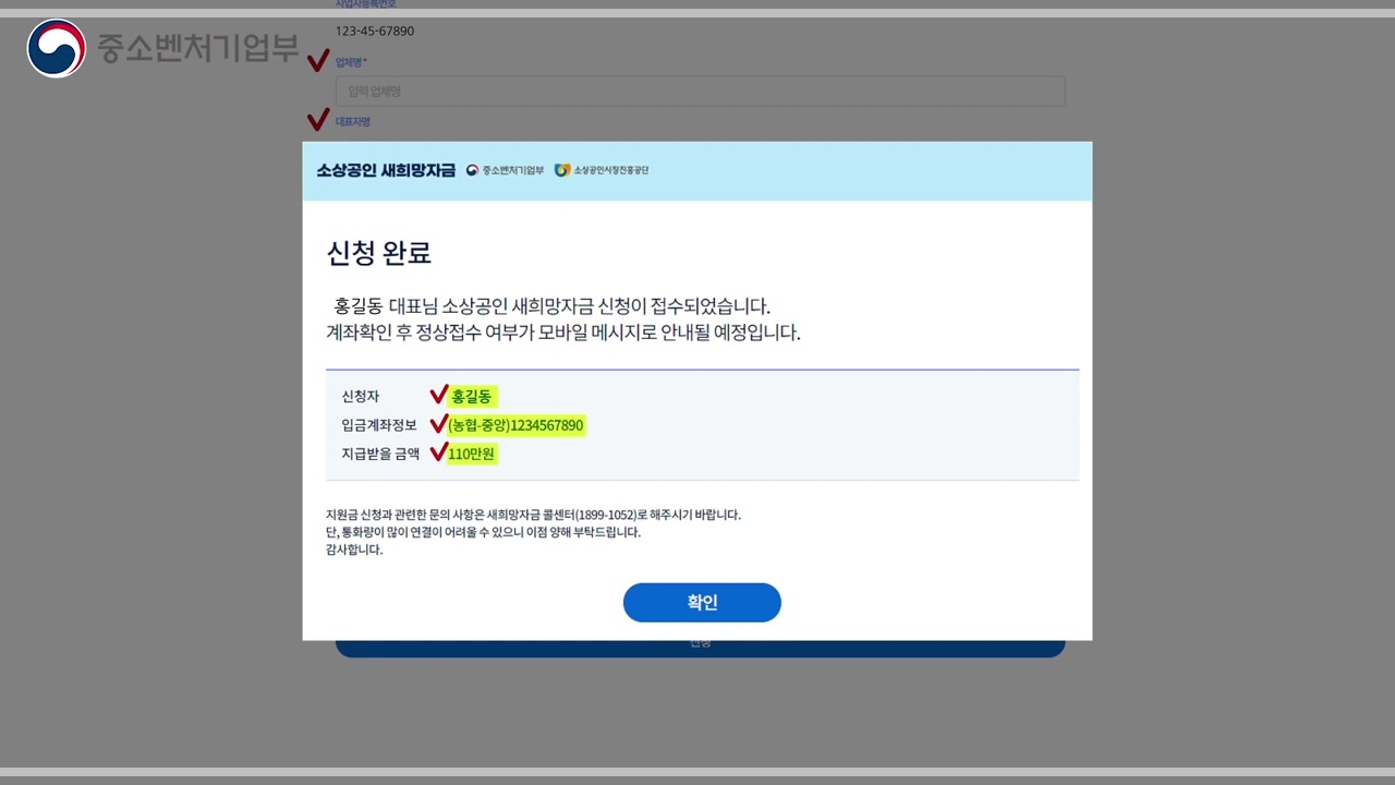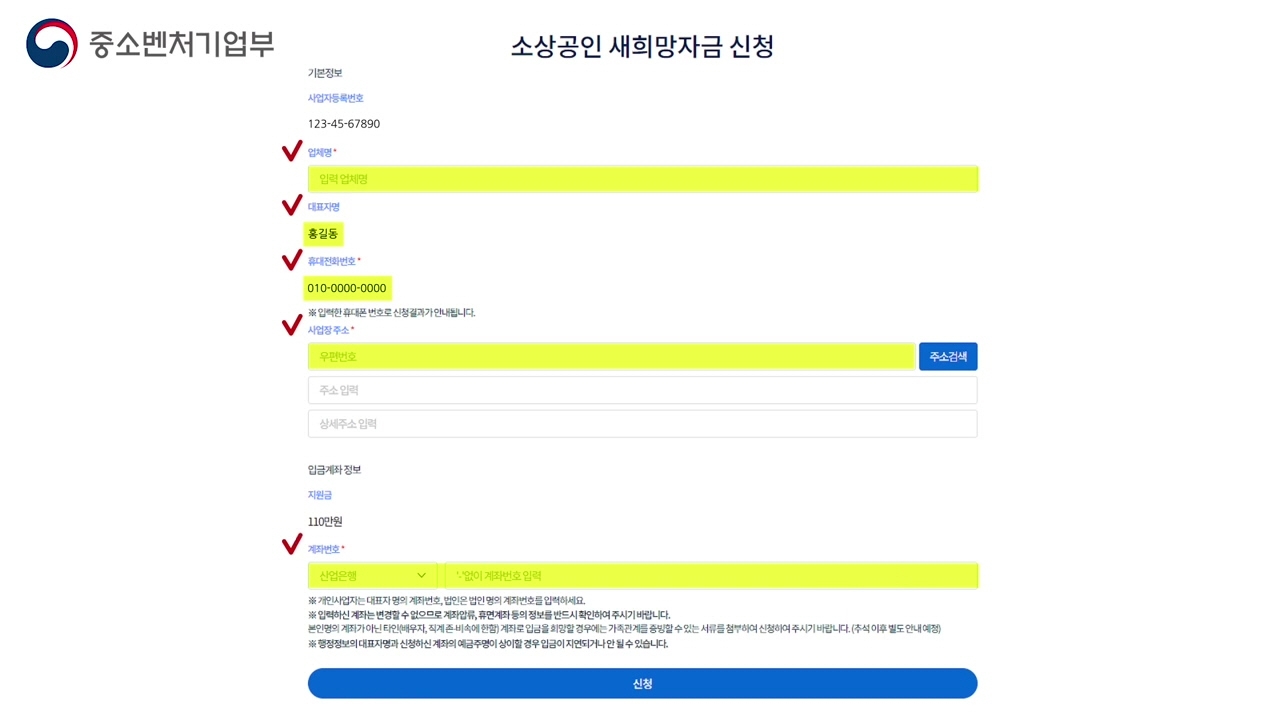 최종 신청 결과는 입력한 휴대폰 문자로 확인이 가능합니다. 신청정보와 계좌 예금주 정보가 다를 경우 정상적으로 신청이 안됩니다.