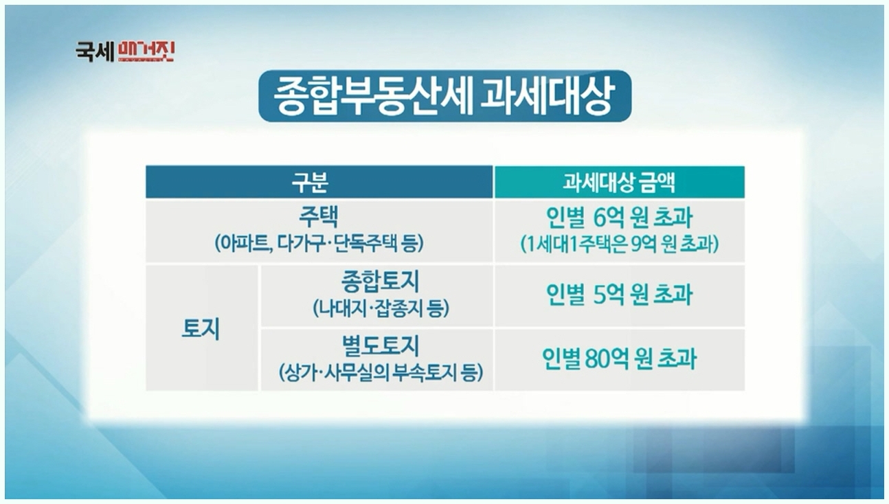 선박이나 항공도 마찬가지로 적용되고요. 1세대 1주택자라는 것은 거주자로서 세대원 중에 1명만 재산세를 내야 하는 대상이고 1 주택을 단독으로 소유하고 있는 경우를 뜻하는 의미이니, 자신이 종부세를 내야 하는 것인지 아닌 것인지 궁금하신 분들은 한 번 체크해보시면 많은 도움이 될 것 같습니다.