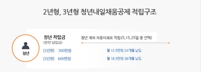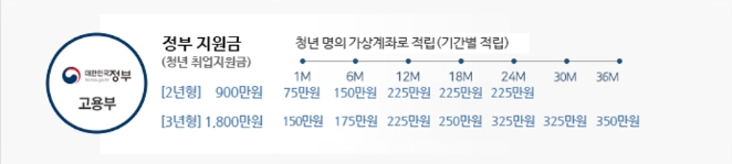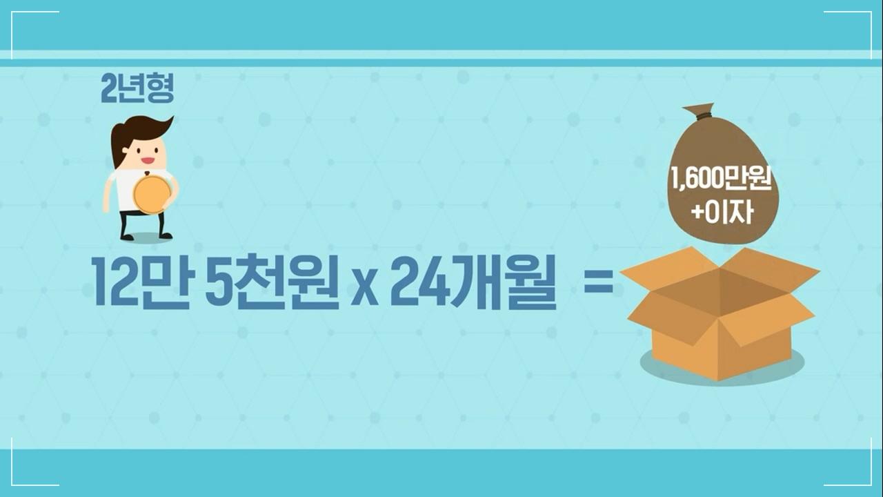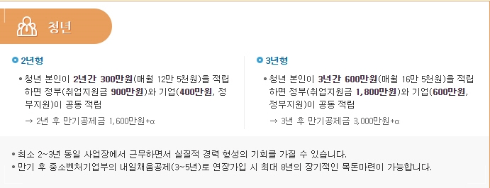 2년형의 경우 청년 가입자 본인이 매월 125,000원씩 총 300만 원을 적립하면 정부에서 900만 원과 기업에서 400만 원을 공동 적립하여 2년 만기 후 1,600만 원 +α 만큼 받을 수 있습니다.